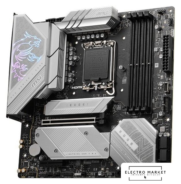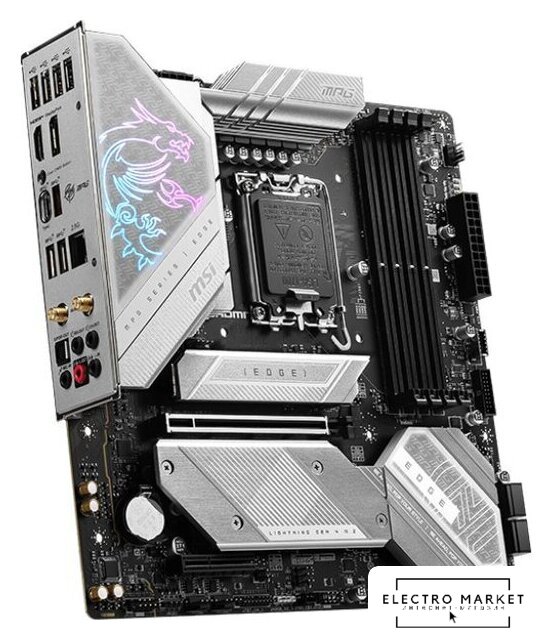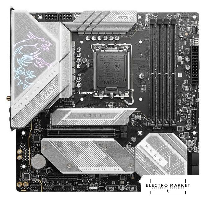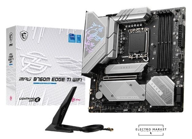 mATX, сокет Intel LGA1700, чипсет Intel B760, память 4xDDR4 до 5333 МГц, слоты: 2xPCIe x16 5.0, 1xPCIe x1, 3xM.2, 802.11ax (Wi-Fi 6)+Bluetooth 5.2, 12+1 фаз питания