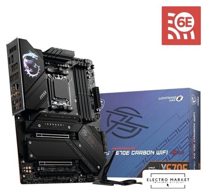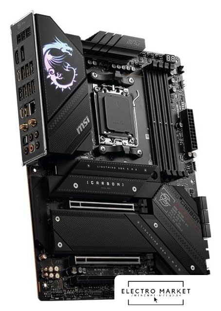 ATX, сокет AMD AM5, чипсет AMD X670E, память 4xDDR5 до 8000 МГц, слоты: 2xPCIe x16 5.0, 1xPCIe x4, 4xM.2, 14+2+2 фаз питания