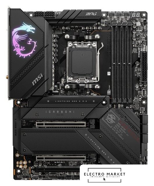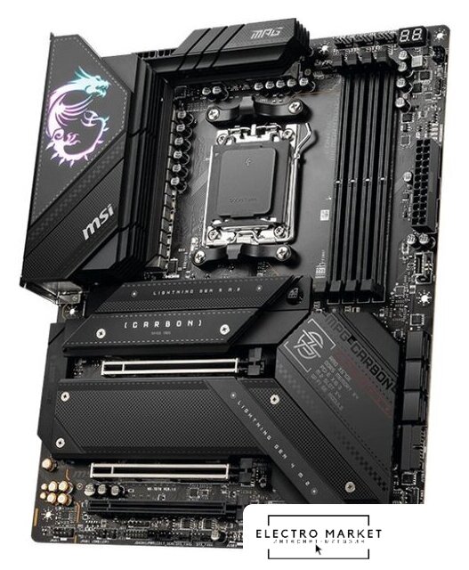 eATX, сокет AMD AM5, чипсет AMD X870E, память 4xDDR5 до 8200 МГц, слоты: 2xPCIe x16 5.0, 4xM.2, 802.11be (Wi-Fi 7)+Bluetooth 5.4, 24+2+1 фаз питания