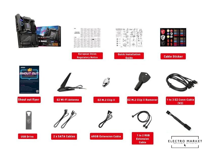 Комплектация | Board• 1x MotherboardDocumentation• 1x Quick installation guide• 1x European Union Regulatory NoticesApplication• 1x USB driveCables• 2x SATA 6Gb/s cables• 1x 1 to 2 RGB extension cable• 1x ARGB extension cable• 1x 1 to 3 EZ Conn-Cable (V2)• 1x EZ Front panel cableAccessories• 1x EZ Wi-Fi Antenna• 1x Cable sticker• 1x EZ M.2 Clip II• 1x EZ M.2 Clip II Remover |