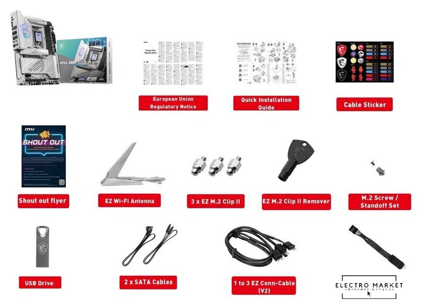 Комплектация | - EZ Wi-Fi антенна - USB Flash накопитель - стикеры для кабелей- 2 кабеля SATA- EZ кабель фронтальной панели- 1EZ - 3EZ кабель - ключ-экстрактор EZ M.2 Clip II - монтажный комплект M.2- документация |