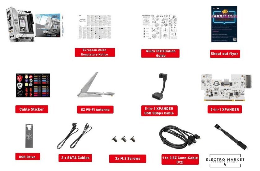 | Комплектация | - EZ Wi-Fi антенна - USB Flash накопитель - стикеры для кабелей- 2 кабеля SATA- EZ кабель фронтальной панели- 1EZ - 3EZ кабель - винты для M.2- карта расширения 5-in-1 XPANDER- кабель для карты расширения 5-in-1 XPANDER- документация |