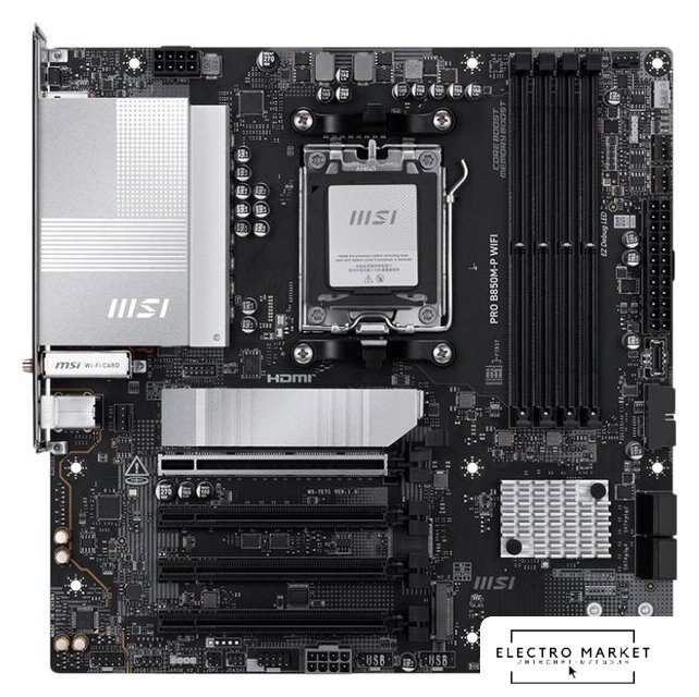 mATX, сокет AMD AM5, чипсет AMD B850, память 4xDDR5 до 8200 МГц, слоты: 2xPCIe x16 5.0, 2xM.2, 802.11ax (Wi-Fi 6E)+Bluetooth 5.3, 10+2+2 фаз питания