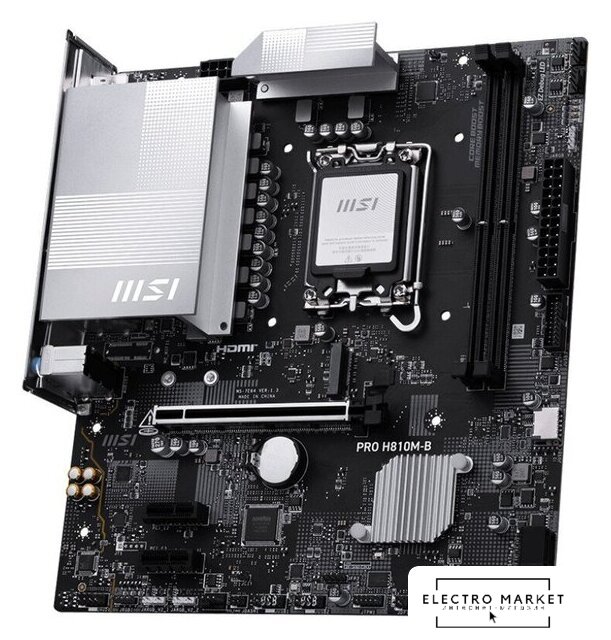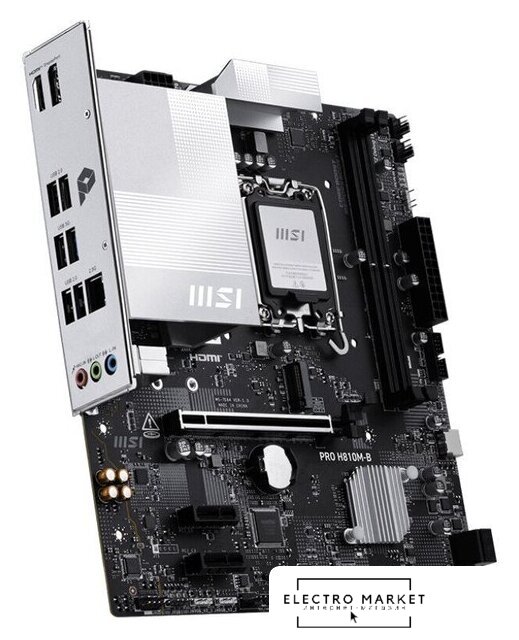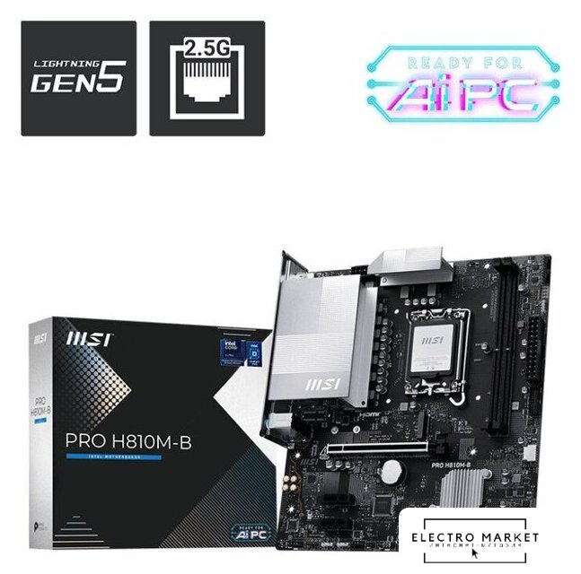 mATX, чипсет Intel H810, память 2xDDR5 до 6400 МГц, слоты: 1xPCIe x16 4.0, 1xPCIe x1, 1xM.2, 802.11ax (Wi-Fi 6)+Bluetooth 5.3, 4+1+2 фаз питания