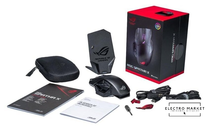 | Комплектация | 1 игровая мышь ROG Spatha X 1 беспроводной адаптер / док-станция для зарядки 2 кабеля ROG Paracord Type-C на USB длиной 2 метра 2 микропереключателя ROG со сроком службы 70 миллионов нажатий 1 отвертка 1 чехол 1 наклейка ROG 1 Пользовательская документация 1 Гарантийный талон |