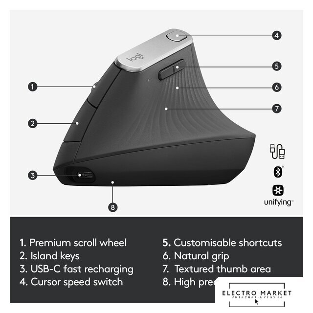 ноутбучная мышь для ПК/для компьютеров Apple/для iPad/для устройств Android/для устройств ChromeOS, проводная USB/беспроводная радио/Bluetooth, сенсор оптический 8000 dpi, 7 кнопок, колесо с нажатием и отклонением, цвет темно-серый