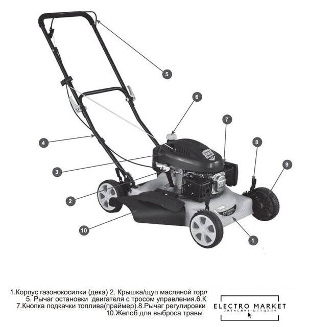колёсная газонокосилка, бензиновый двигатель (4 л.с.), ширина скашивания: 42 см, мягкий травосборник 40 л