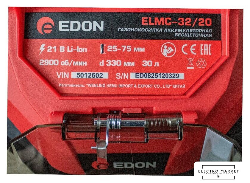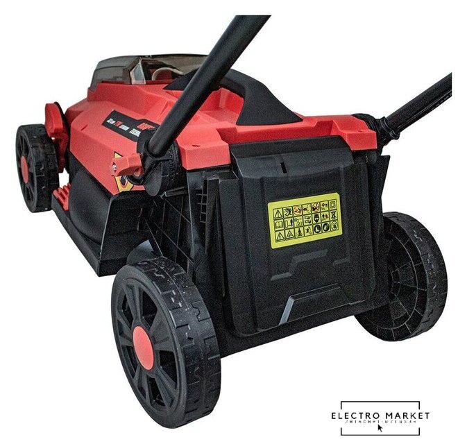 | Комплектация | - Газонокосилка аккумуляторная;, - Рукоятки нижняя и верхняя;, - Травосборник;, - Насадка для мульчирования;, - Аккумуляторная батарея;, - Зарядное устройство;, - Руководство по эксплуатации;, - Упаковка. |
