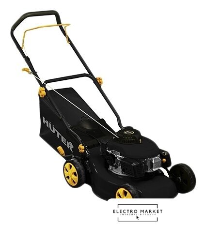 колёсная газонокосилка, бензиновый двигатель (4.5 л.с.), ширина скашивания: 46 см, жесткий травосборник 55 л, корпус: сталь
