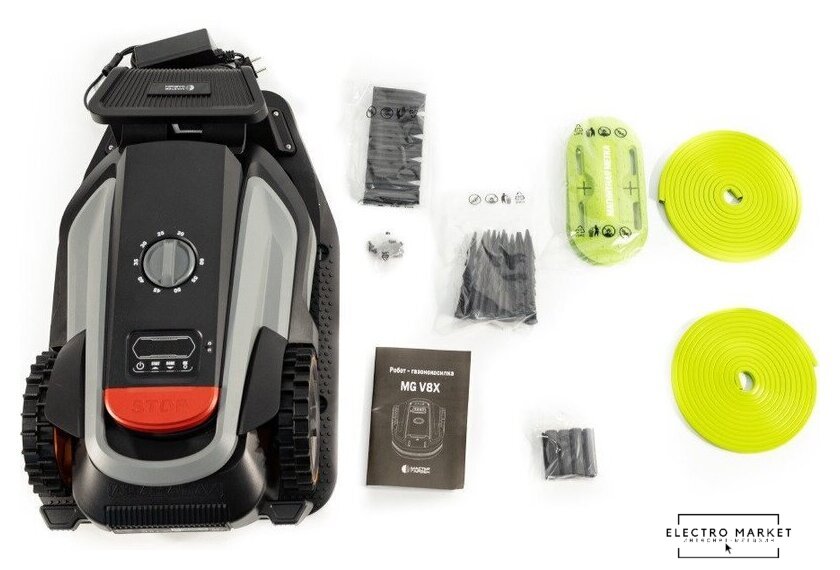 | Комплектация | • Зарядное устройство - 1 шт., • Зарядная станция - 1 шт., • Гвозди для крепления базы - 12 шт., • Ножи - 6 шт. + 3 шт. уже установлены, • Винты для ножей - 6 шт., • Магнитные метки - 2 шт., • Магнитная лента - 5 м × 2, • Крепёж для магнитной ленты - 20 шт., • Инструкция по эксплуатации - 1 шт. |