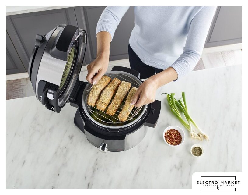 Дополнительные принадлежности | Корзина Cook & Crisp Basket с антипригарным керамическим покрытием на 4,7 л, вмещающая 1,8 кг картофеля фри, двухъярусная двусторонняя решетка, идеально подходящая для выкладывания слоями. |