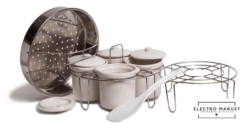 мультиварка-скороварка, объем 6 л, покрытие чаши нержавеющая сталь, мощность 1000 Вт, 9 программ, пароварка, йогуртница