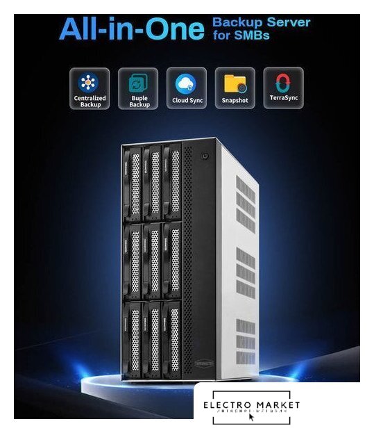 12 x 3.5"/2.5"/M.2 SATA 3.0, RAID 1/5/6/10/JBOD, hot swap, охлаждение воздушное, LAN 2x 10 Гбит/с, 2x USB-A 3.2 Gen1, 3x USB-A 3.2 Gen2, 1x USB-С 3.2 Gen2