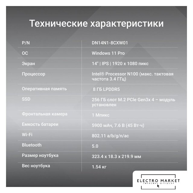 14.0" 1920 x 1080, IPS, 60 Гц, Intel Processor N100, 8 ГБ LPDDR5, SSD 256 ГБ, видеокарта встроенная, без ОС, цвет крышки черный, аккумулятор 45.6 Вт·ч