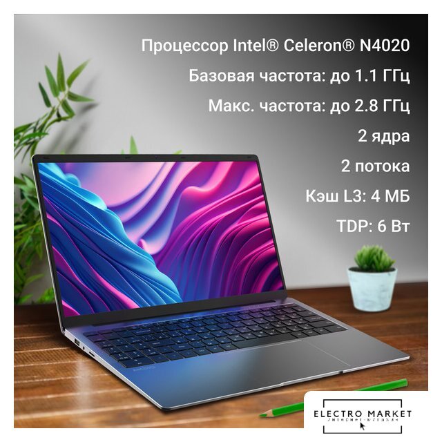 15.6" 1920 x 1080, IPS, 60 Гц, Intel Celeron N4020, 8 ГБ LPDDR4, SSD 256 ГБ, видеокарта встроенная, Windows 11 Pro, цвет крышки серебристый, аккумулятор 37 Вт·ч