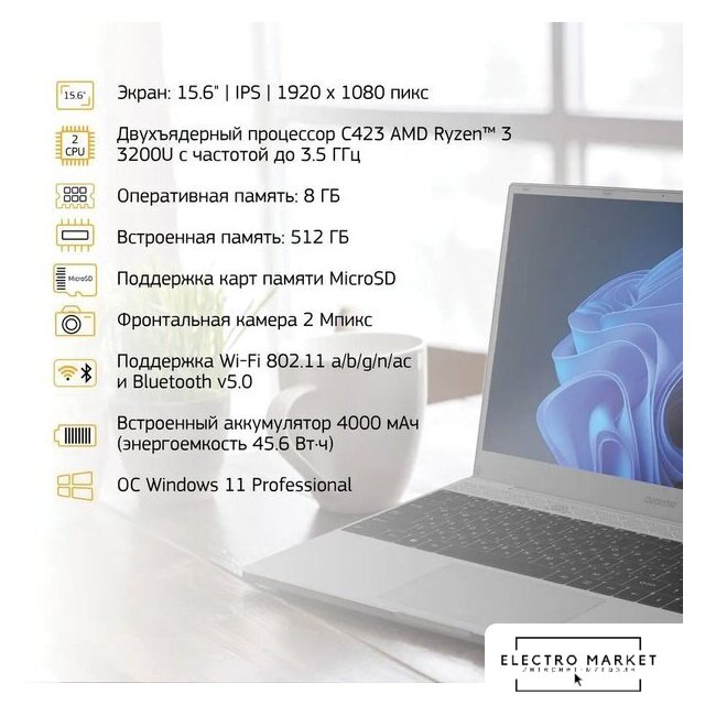 15.6" 1920 x 1080, IPS, 60 Гц, AMD Ryzen 5 7430U, 16 ГБ DDR4, SSD 512 ГБ, видеокарта встроенная, Windows 11 Pro, цвет крышки серый, аккумулятор 48.5 Вт·ч