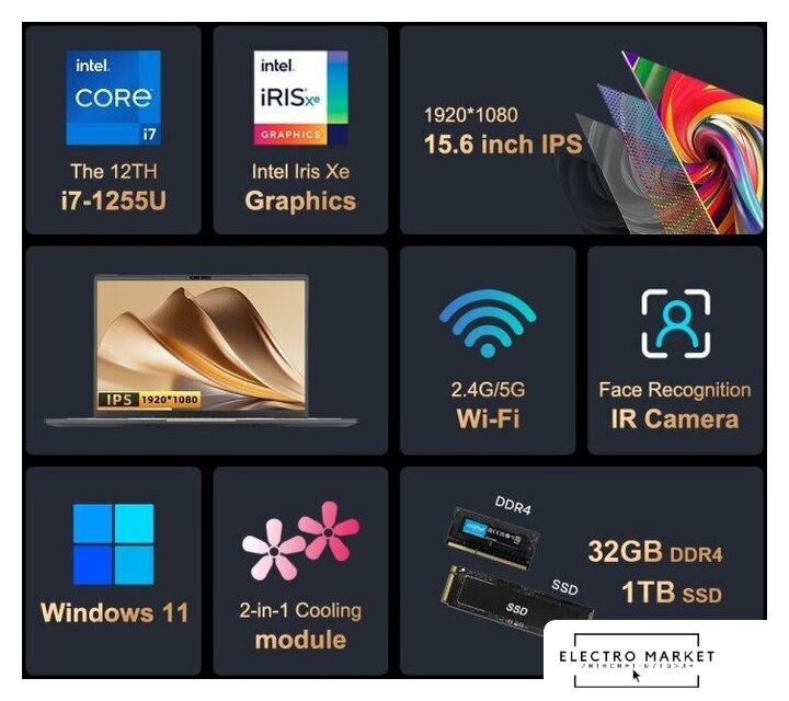 15.6" 1920 x 1080, IPS, 60 Гц, Intel Core i7 1255U, 16 ГБ DDR4, SSD 512 ГБ, видеокарта встроенная, Windows 11 Pro, цвет крышки серый, аккумулятор 48.5 Вт·ч