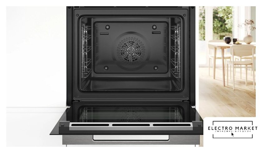 электрический с конвекцией, объем 44 л, 8 режимов, очистка паровая + пиролитическая, 4 стекла в дверце, направляющие проволочные + телескопические (1 уровень)