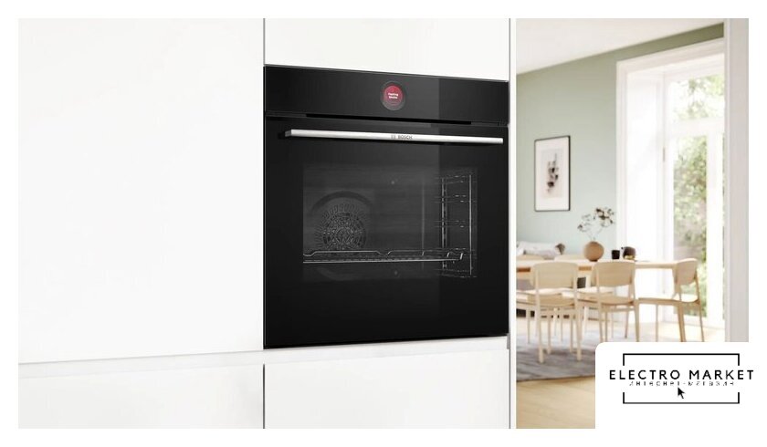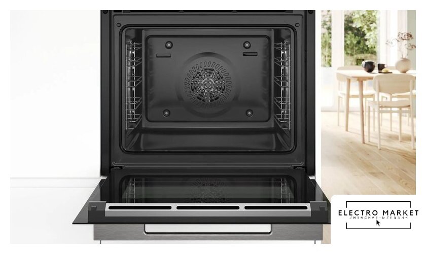 электрический с конвекцией, объем 72 л, утапливаемые переключатели, 9 режимов, автопрограммы, очистка пиролитическая, 3 стекла в дверце, направляющие проволочные + телескопические (1 уровень), термощуп