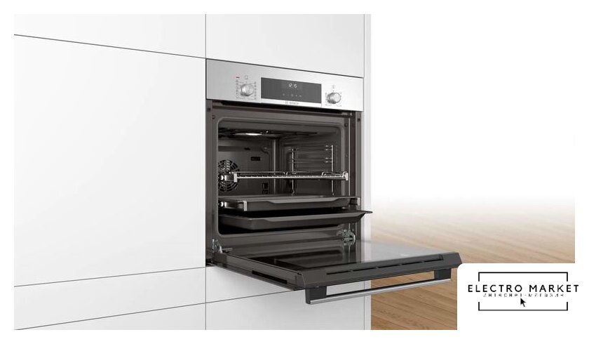 электрический с конвекцией, объем 72 л, утапливаемые переключатели, 9 режимов, очистка пиролитическая, 4 стекла в дверце, направляющие проволочные + телескопические (1 уровень)