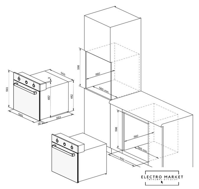 электрический с конвекцией, объем 60 л, 8 режимов, очистка ручная, проволочные направляющие, энергопотребление A