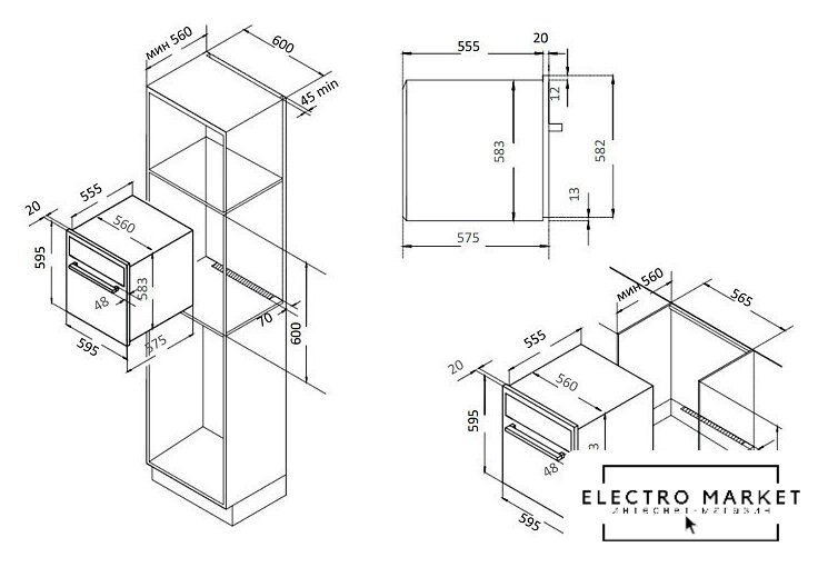 электрический с конвекцией, объем 60 л, 8 режимов, очистка ручная, проволочные направляющие, энергопотребление A