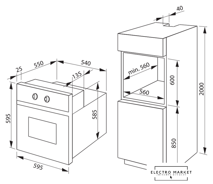 электрический с конвекцией, объем 60 л, 6 режимов, очистка ручная, проволочные направляющие, энергопотребление A