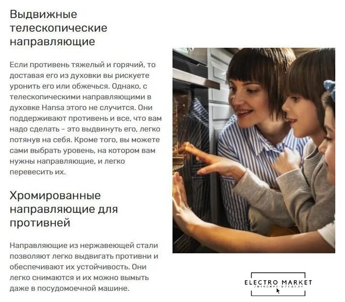 электрический с конвекцией, объем 70 л, утапливаемые переключатели, 6 режимов, очистка ручная, 2 стекла в дверце, направляющие проволочные