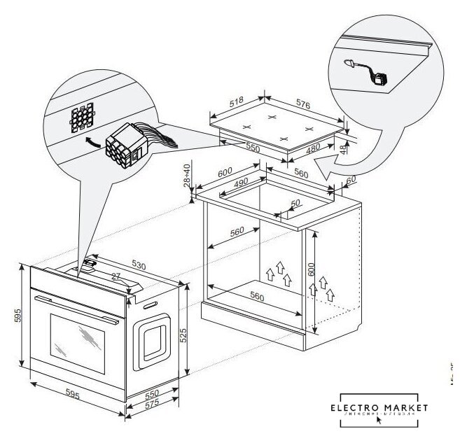 электрический с конвекцией, объем 60 л, 8 режимов, очистка ручная, проволочные направляющие, телескопические направляющие, энергопотребление A