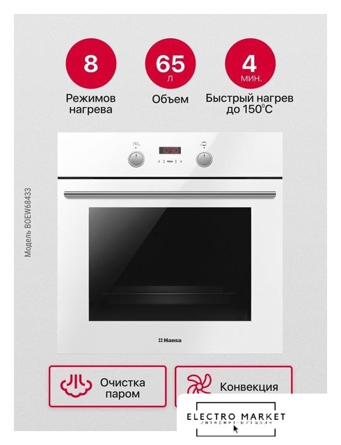 электрический с конвекцией, объем 66 л, 0 режимов, очистка паровая, проволочные направляющие, телескопические направляющие