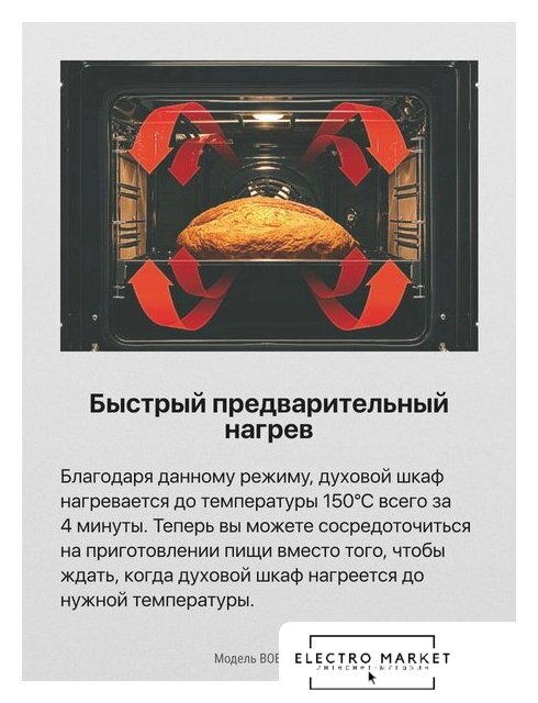 | Режимы работы | нижний нагрев, двухсторонний нагрев, большой гриль, гриль + конвекция, двухсторонний нагрев + конвекция, размораживание, предварительный разогрев духовки |