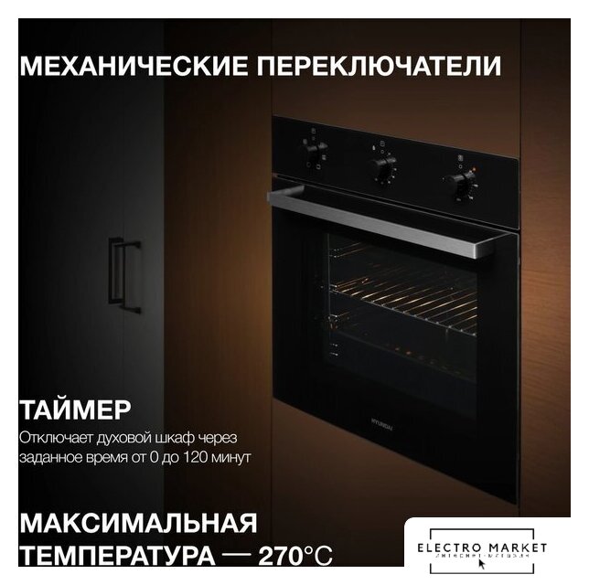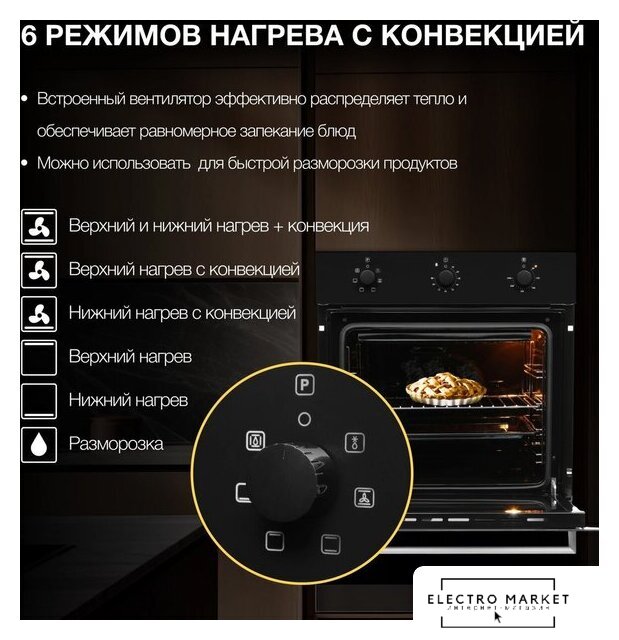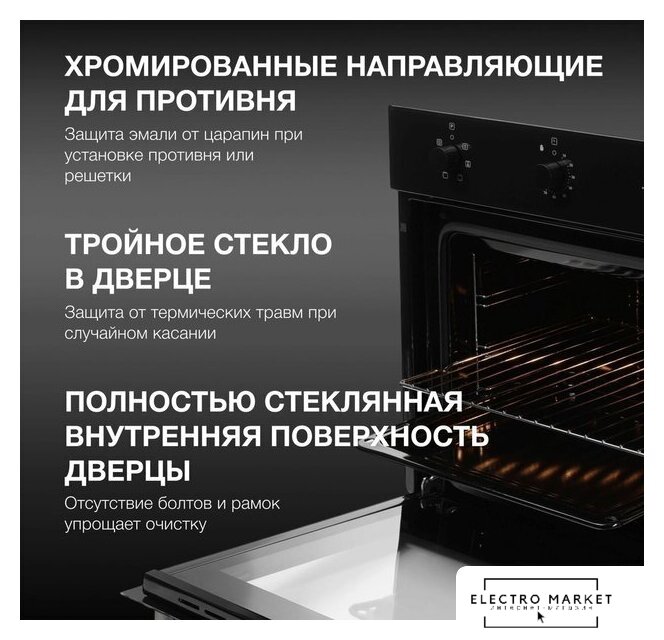 электрический с конвекцией, объем 65 л, 7 режимов, 2 стекла в дверце, направляющие проволочные