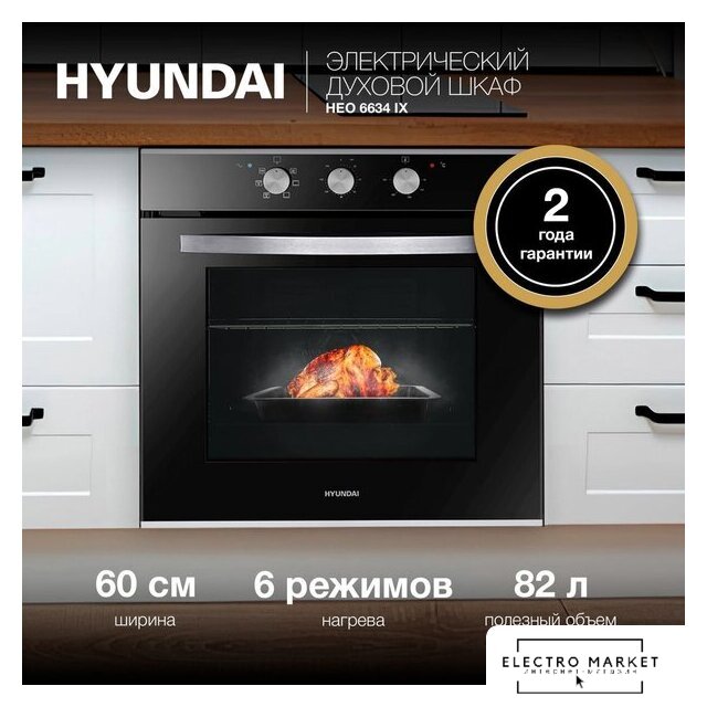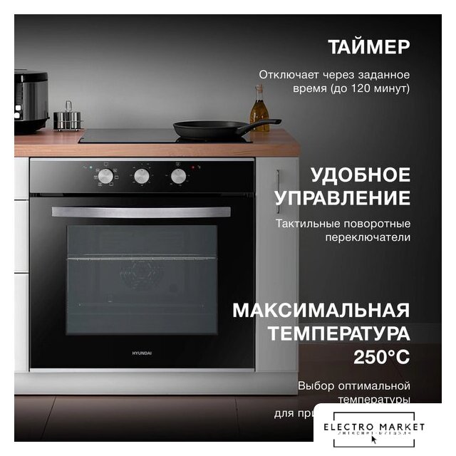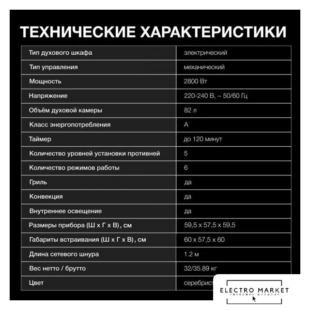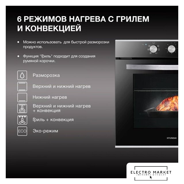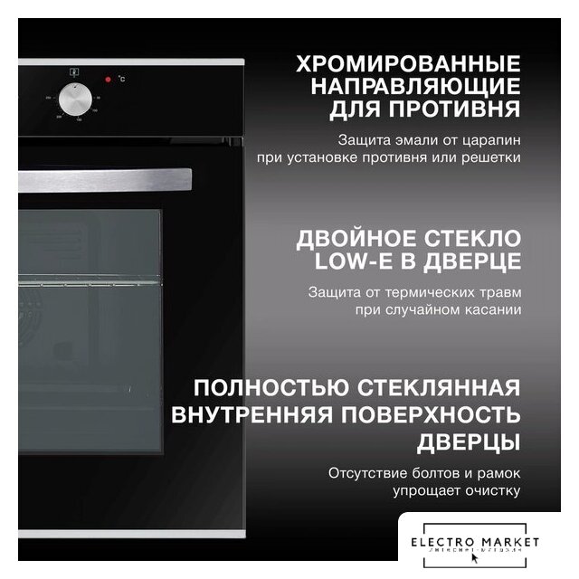 электрический с конвекцией, объем 50 л, утапливаемые переключатели, 6 режимов, 3 стекла в дверце, направляющие проволочные