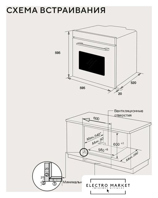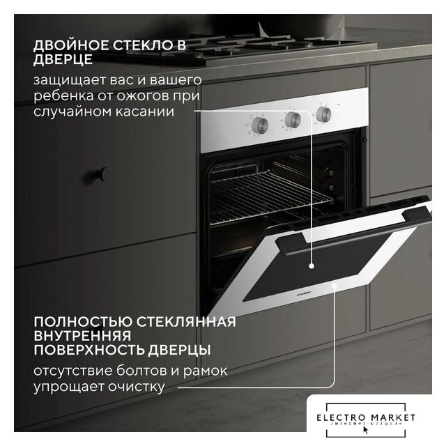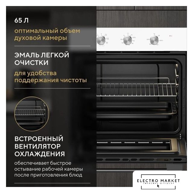 электрический с конвекцией, объем 60 л, 8 режимов, очистка ручная, проволочные направляющие