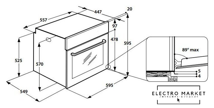 электрический с конвекцией, объем 67 л, утапливаемые переключатели, 6 режимов, очистка ручная, 3 стекла в дверце, направляющие проволочные