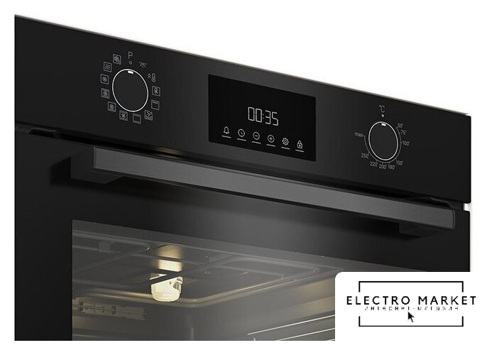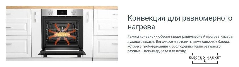 электрический с конвекцией, объем 65 л, утапливаемые переключатели, 6 режимов, очистка ручная, 2 стекла в дверце, направляющие проволочные