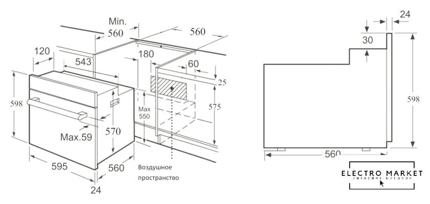 электрический с конвекцией, объем 74 л, 9 режимов, очистка ручная, 3 стекла в дверце, направляющие проволочные + телескопические