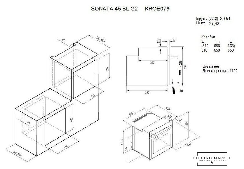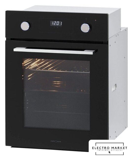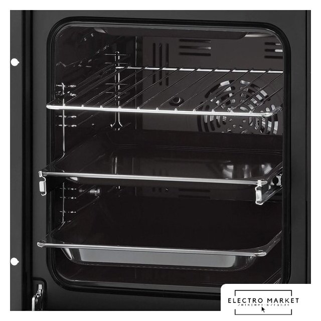 электрический с конвекцией, объем 60 л, утапливаемые переключатели, 10 режимов, очистка паровая, 3 стекла в дверце, направляющие проволочные