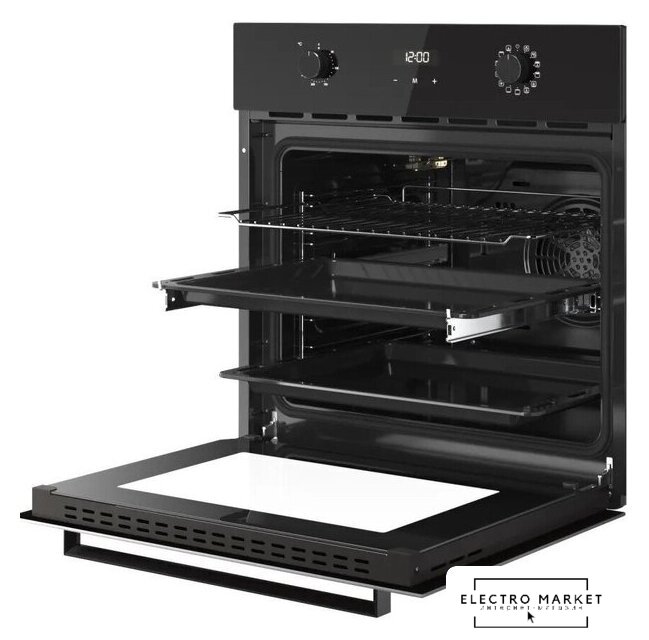электрический с конвекцией, объем 69 л, 7 режимов, очистка каталитическая + паровая, 3 стекла в дверце, направляющие проволочные + телескопические (1 уровень)