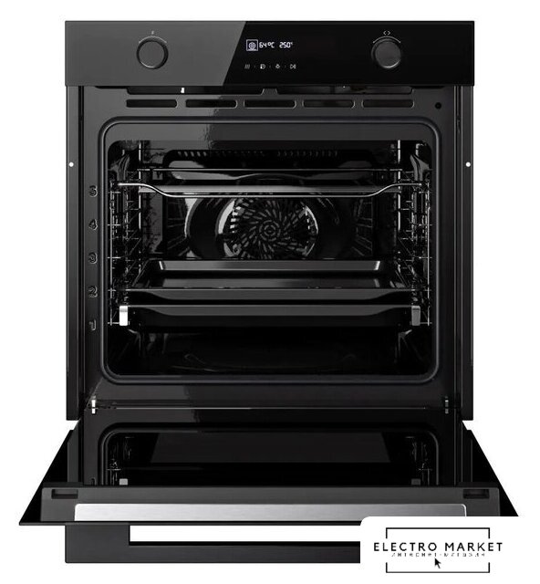 электрический с конвекцией, объем 66 л, утапливаемые переключатели, 8 режимов, очистка паровая, 2 стекла в дверце, направляющие рельефные (0 уровней)