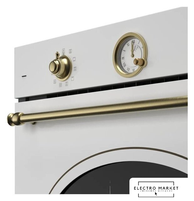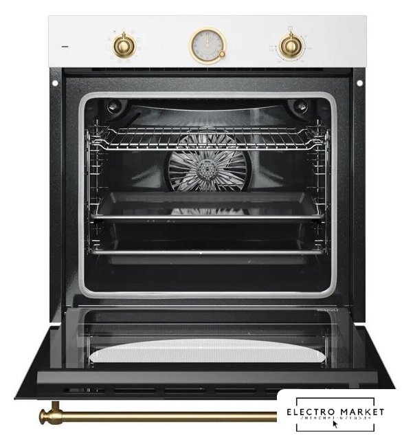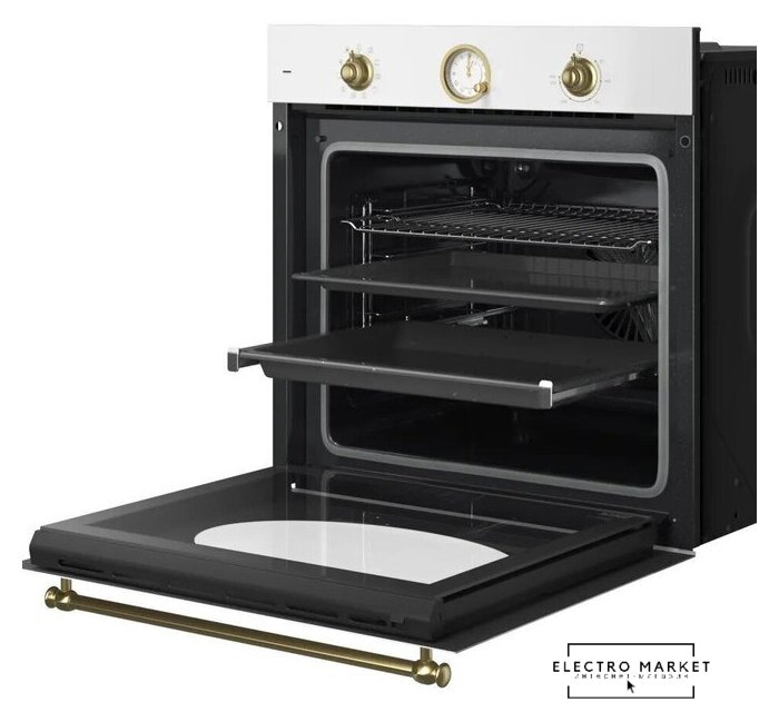электрический с конвекцией, объем 67 л, ретродизайн, 8 режимов, очистка каталитическая, 3 стекла в дверце, направляющие проволочные + телескопические (1 уровень)