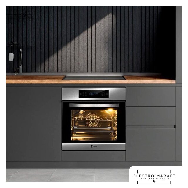 электрический с конвекцией, объем 77 л, утапливаемые переключатели, 10 режимов, очистка паровая, 2 стекла в дверце, направляющие проволочные