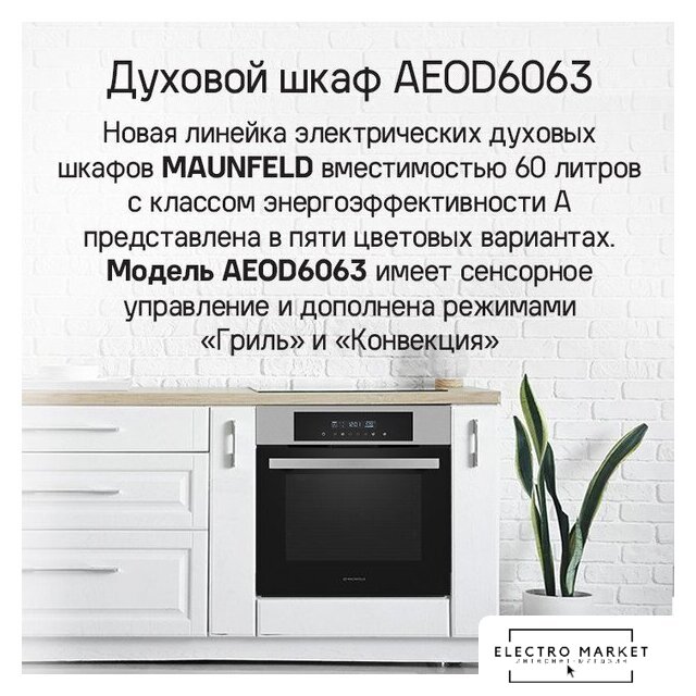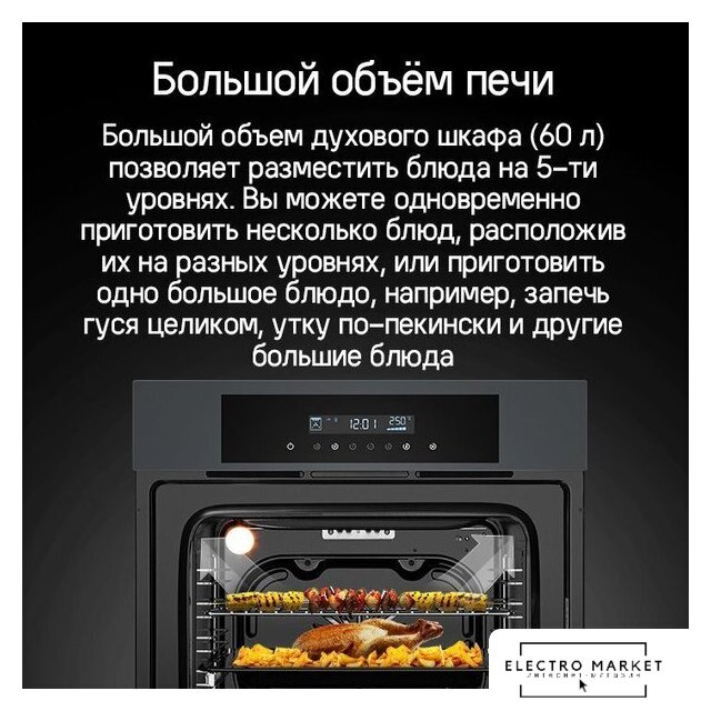 электрический с конвекцией, объем 69 л, 8 режимов, очистка паровая, проволочные направляющие, энергопотребление A