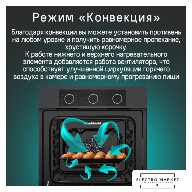 электрический с конвекцией, объем 51 л, 6 режимов, очистка ручная, проволочные направляющие, энергопотребление A