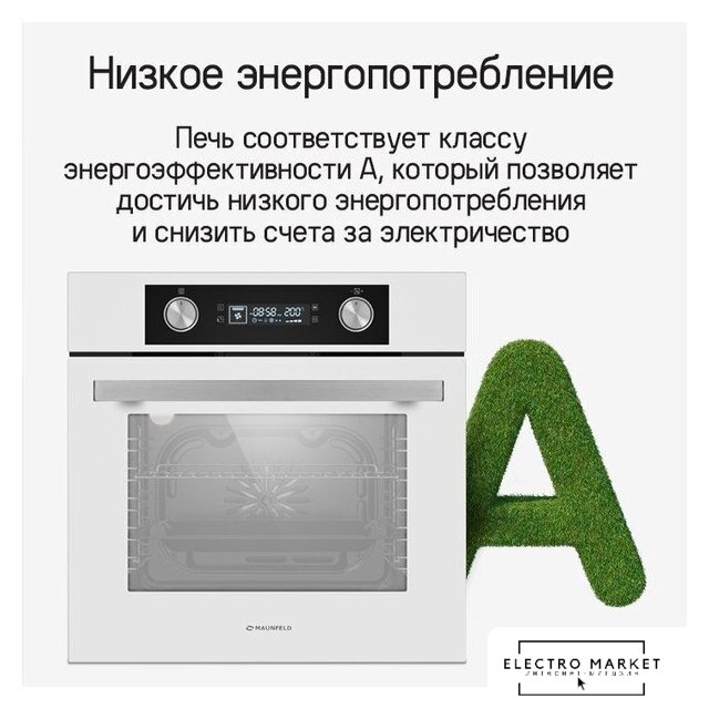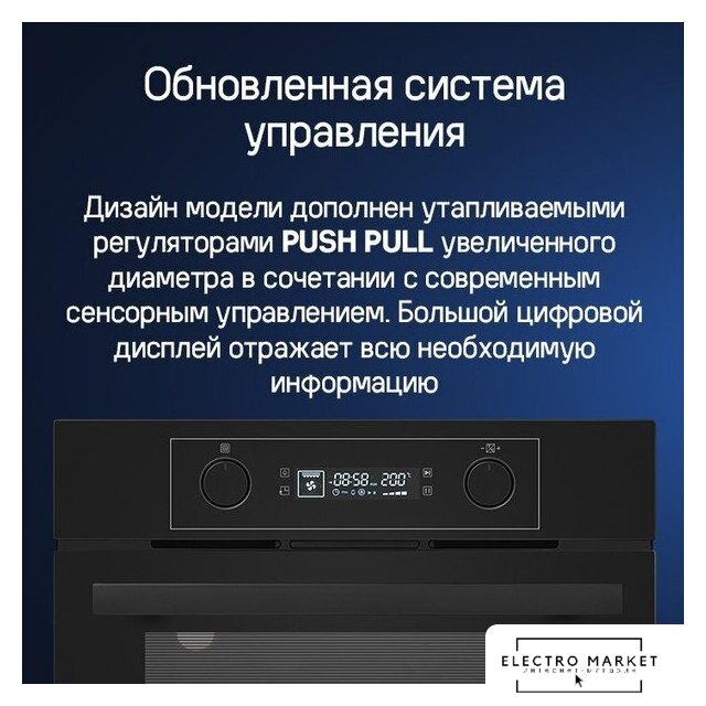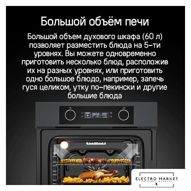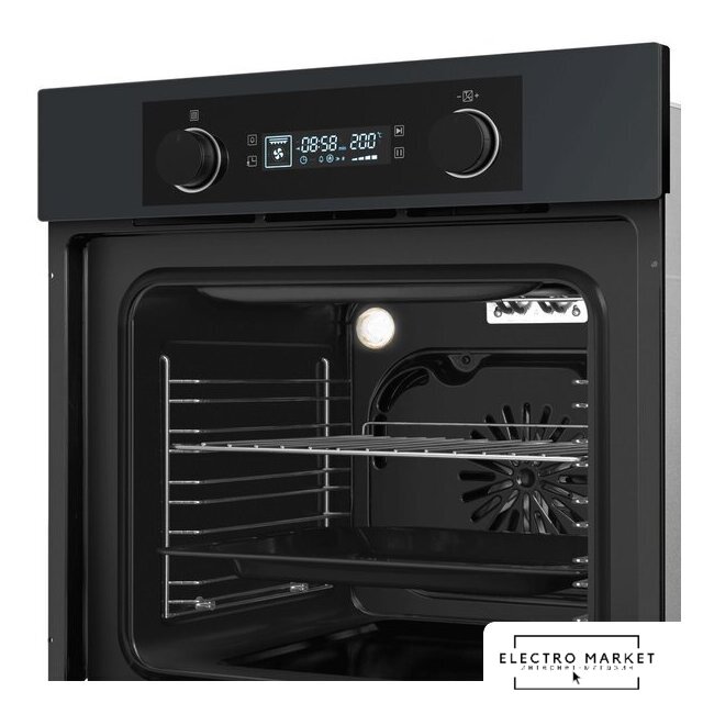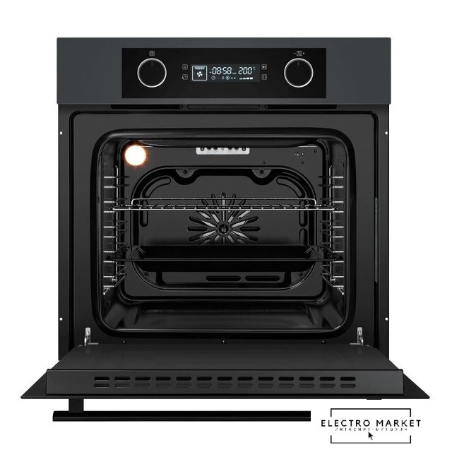 электрический с конвекцией, объем 60 л, 6 режимов, очистка паровая, 3 стекла в дверце, направляющие рельефные