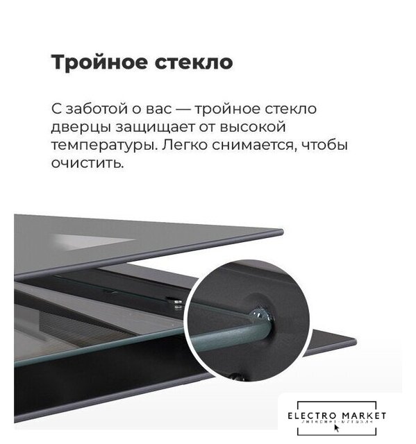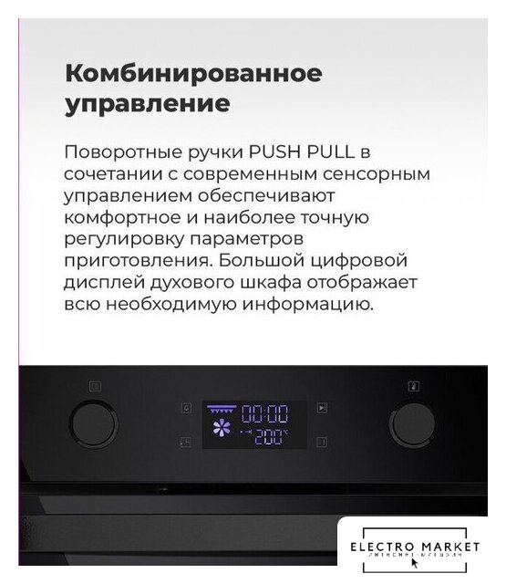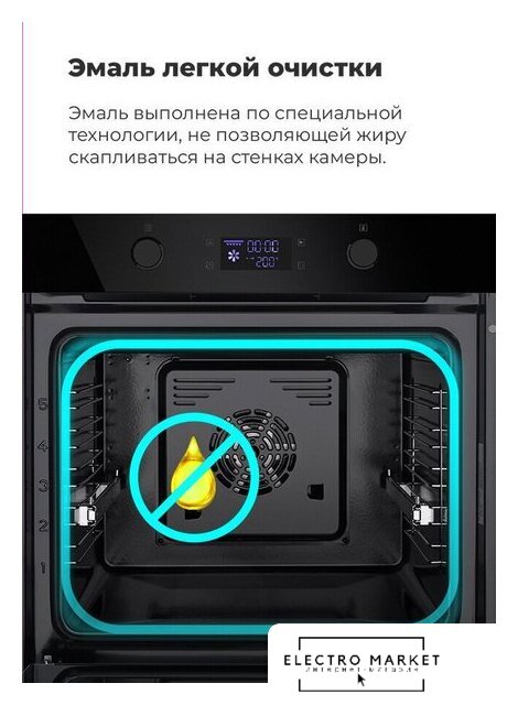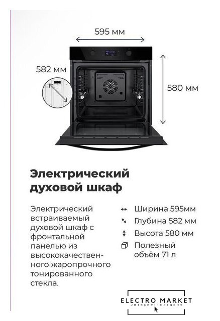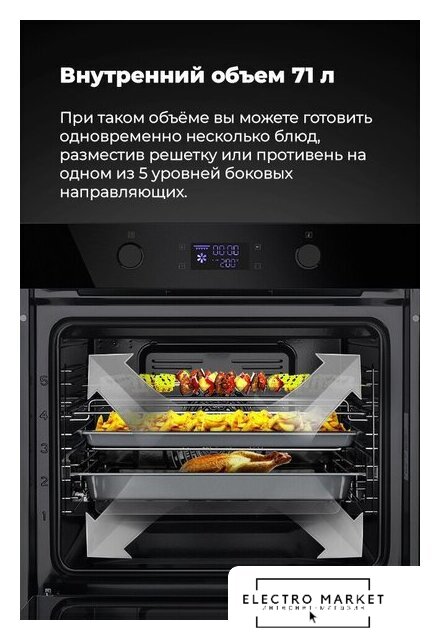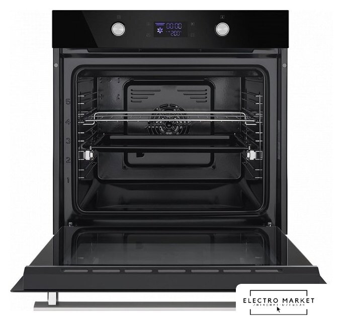 электрический с конвекцией, объем 66 л, 9 режимов, очистка паровая, 2 стекла в дверце, направляющие проволочные