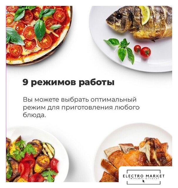 Режимы работы | нижний нагрев, двухсторонний нагрев, большой гриль, гриль + конвекция, двухсторонний нагрев + конвекция, размораживание |