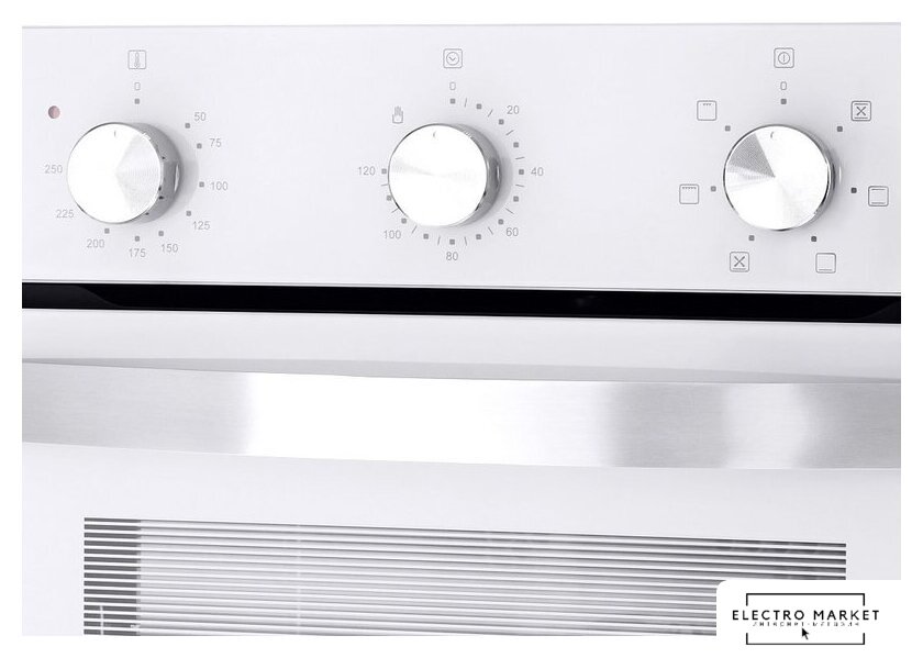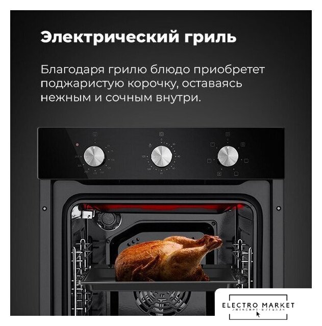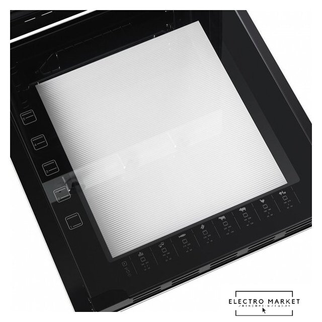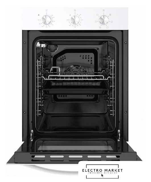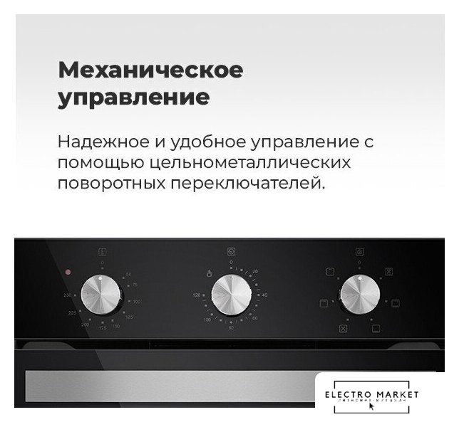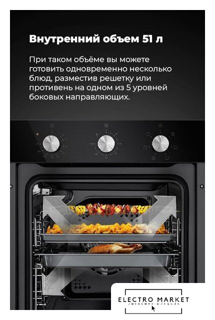 электрический с конвекцией, объем 60 л, утапливаемые переключатели, 6 режимов, очистка паровая, 3 стекла в дверце, направляющие проволочные