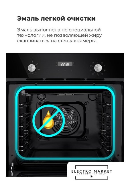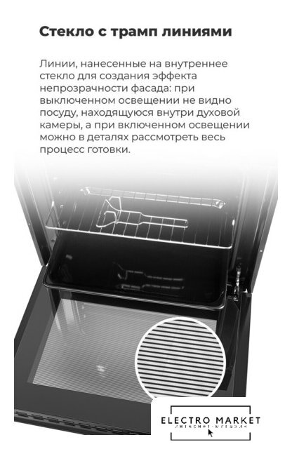 электрический с конвекцией, объем 78 л, утапливаемые переключатели, 7 режимов, очистка ручная, 2 стекла в дверце, направляющие проволочные