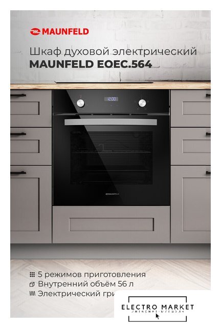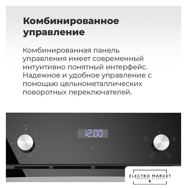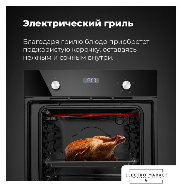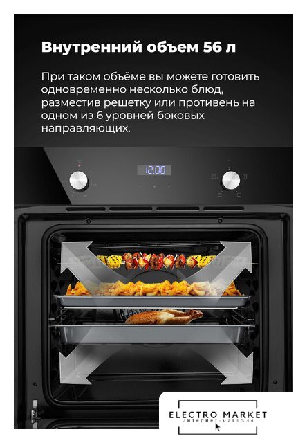 электрический с конвекцией, объем 68 л, 12 режимов, очистка ручная, 3 стекла в дверце, направляющие проволочные + телескопические (1 уровень)